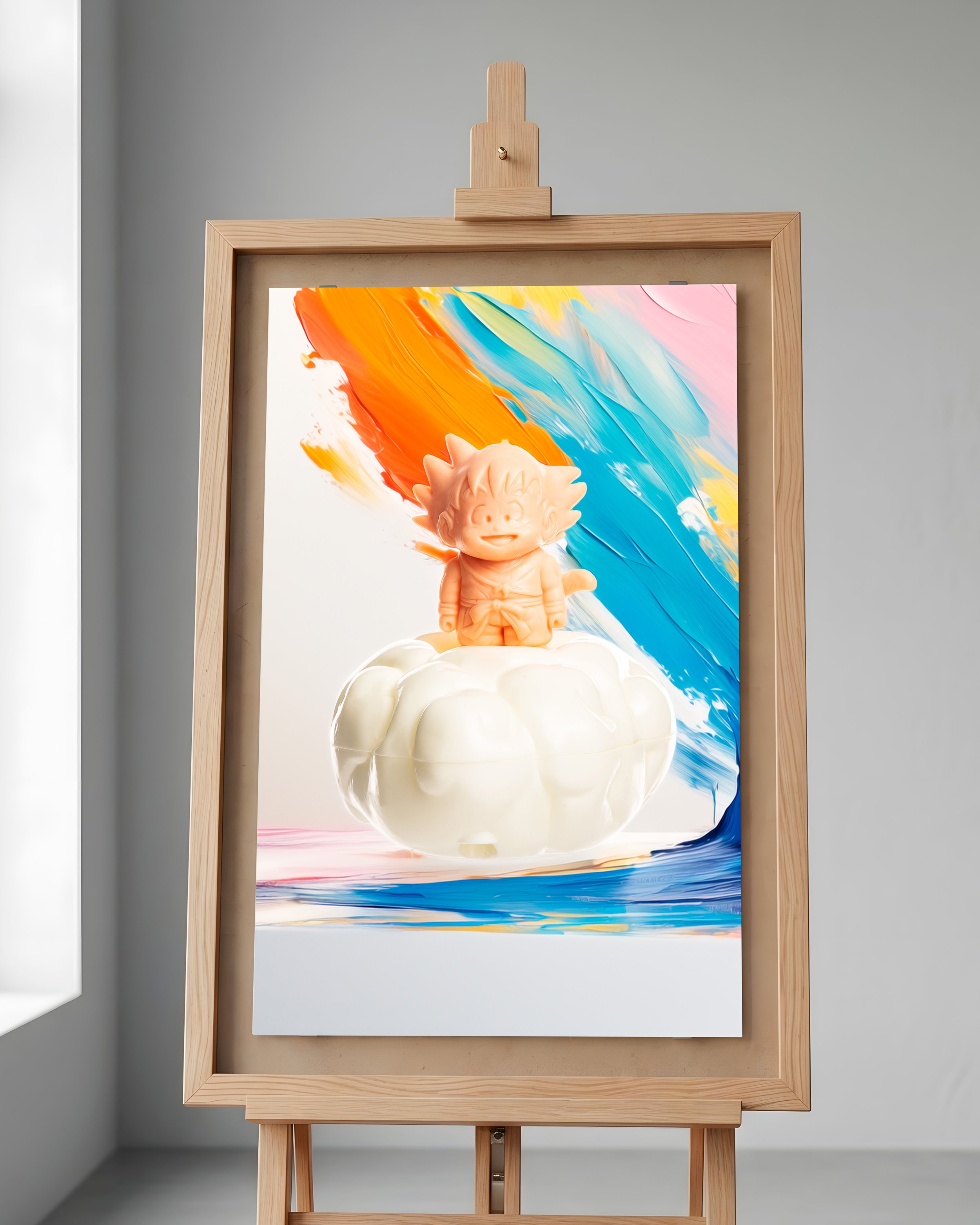 Elevate your space with "Celestial Drift," a serene yet vibrant exploration of peace and boundless potential. This artwork features a minimalist, monochromatic figure perched atop a cloud, suspended in a moment of pure tranquility. It captures the feeling of rising above the noise of the world to find a state of weightless clarity.