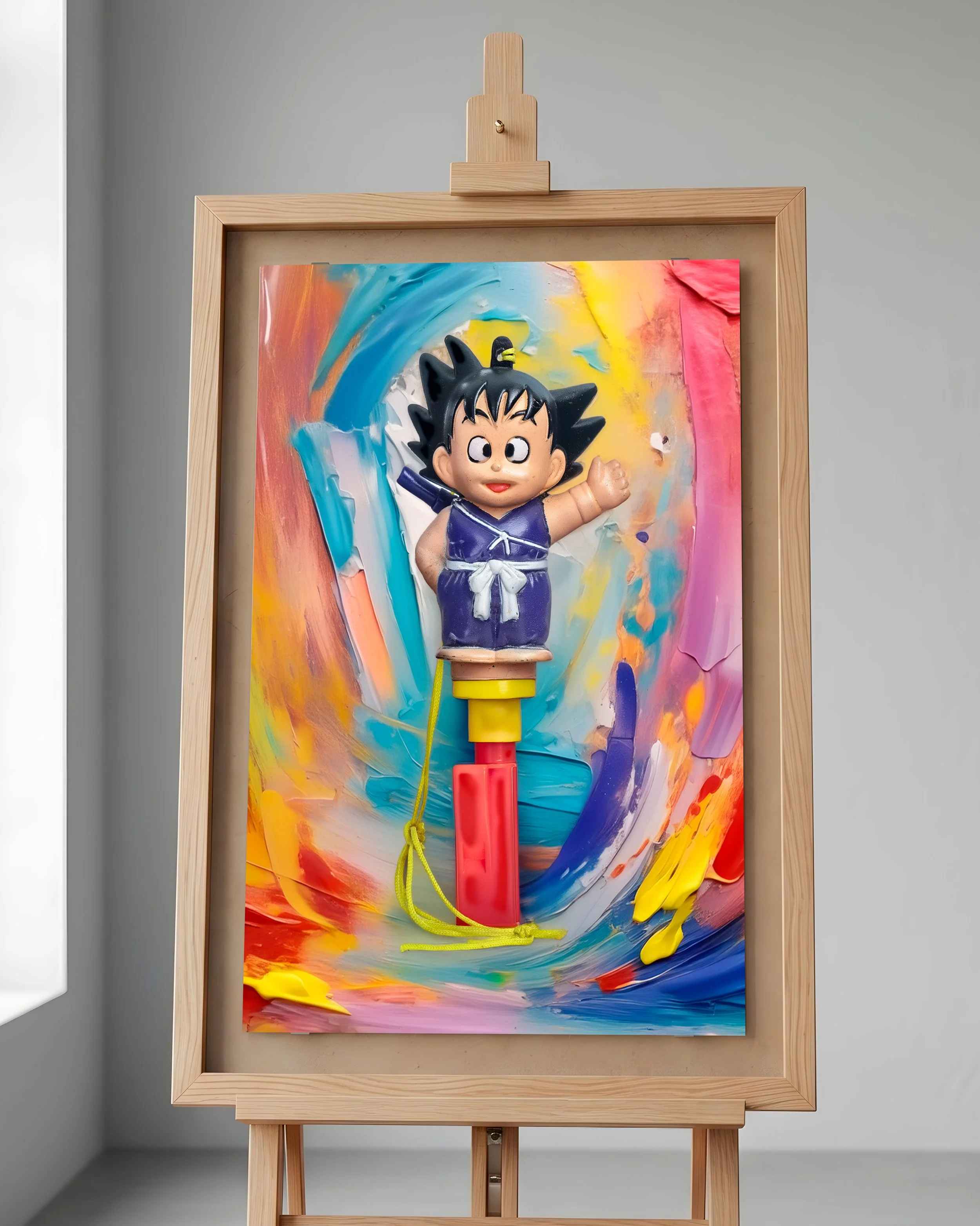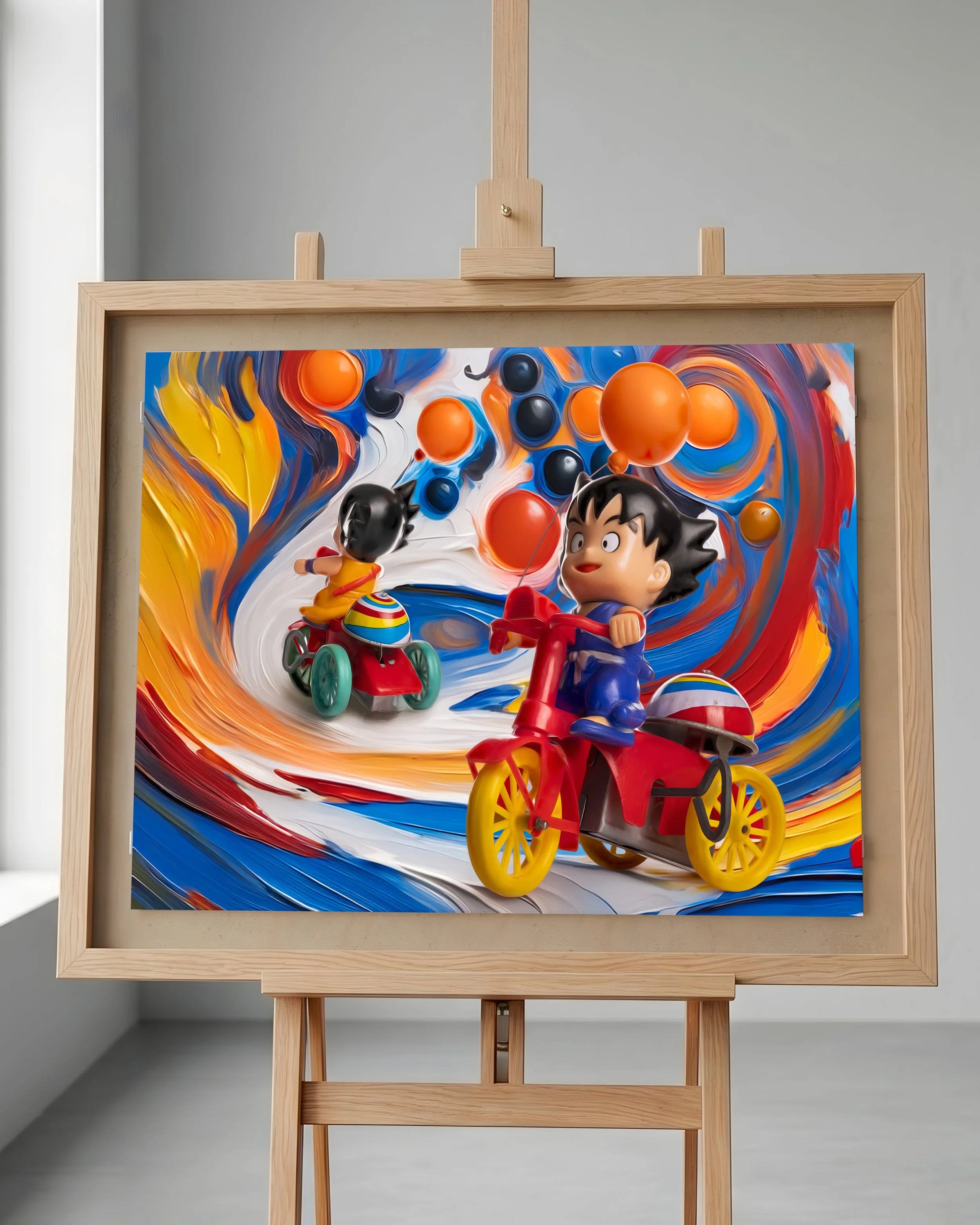 Experience a collision of nostalgia and modern energy with "Whirlwind of Childhood." This striking piece captures the essence of youthful imagination, featuring iconic miniature figures navigating a high-velocity vortex of color. It is a tribute to the fearless spirit of play, where the boundaries between toys and reality dissolve into a rhythmic dance of pigment.